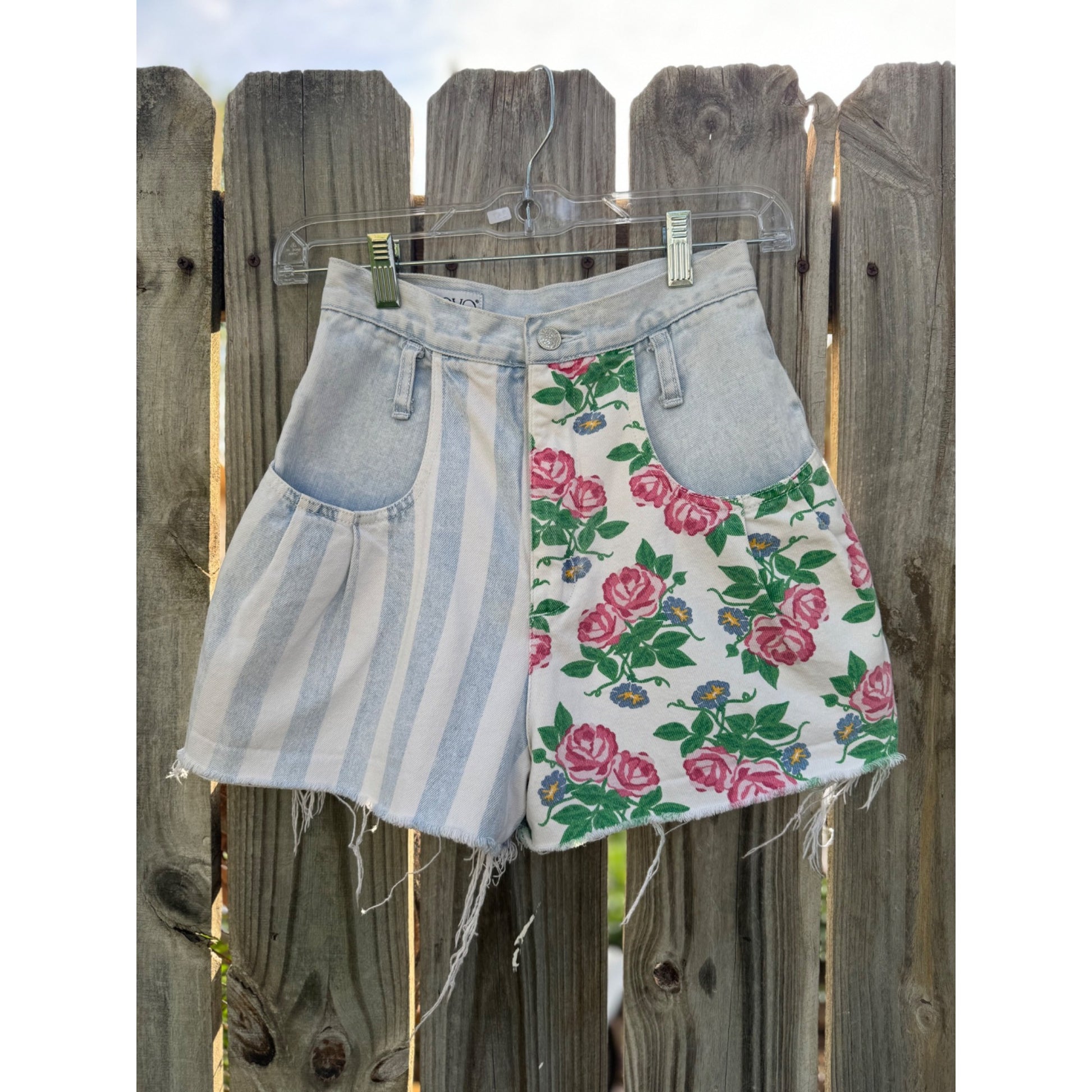 Vintage 90's Nuovo Floral Striped High Rise Cut Off Raw Hem Denim Jean Shorts Size 3